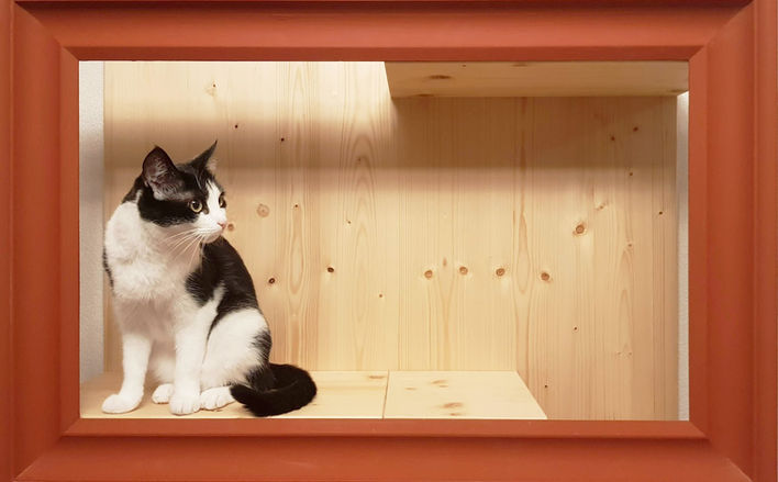 Cet appartement a été conçu pour être le terrain de jeu de trois chats. Tout d’abord, le meuble maître est la bibliothèque de 7 mètres de long où les chats peuvent monter, faire des courses poursuites, se cacher et faire leurs griffes. L’autre caractéristique principale est l’assemblage mi-bois évitant l’utilisation de pièces de métal. Ce meuble a un espace de rangement défini pour différents types d’objets, ainsi qu’une table basse. Tous les meubles de l’appartement ont été pensés sur le même modèle.